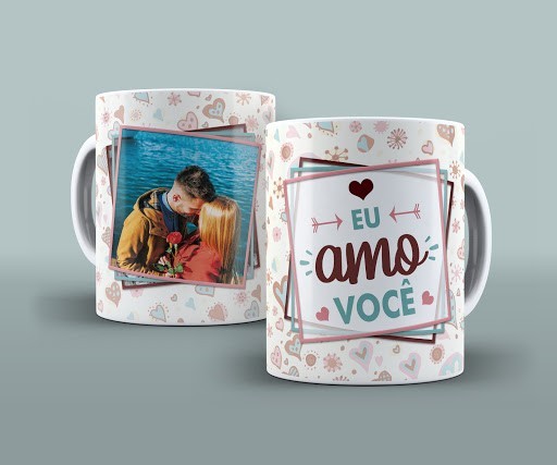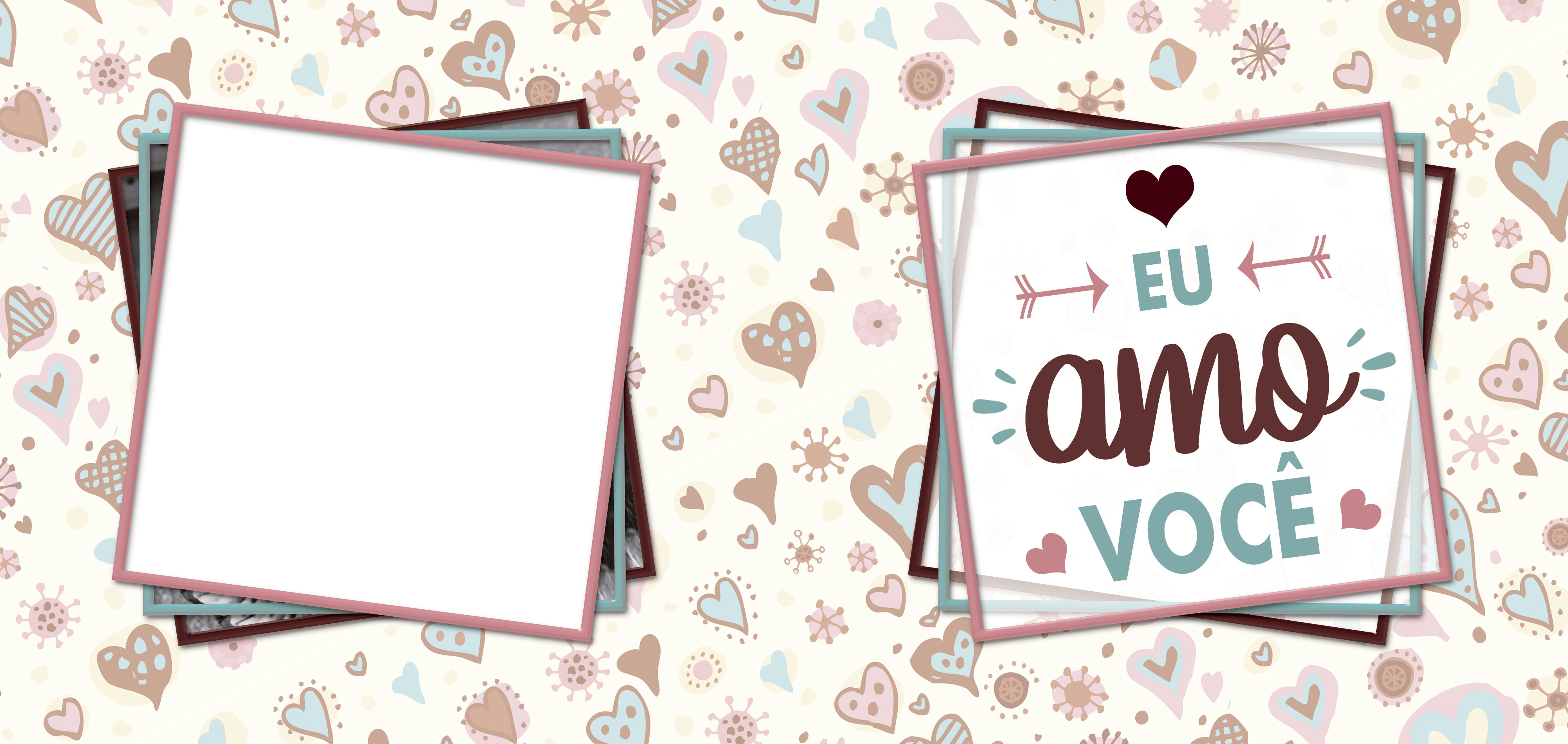 Estampa Dia dos Namorados Eu Amo você, estampa com foto, frase e fundo de corações coloridos.